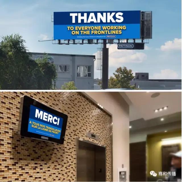 作为美国的邻国,加拿大的数字户外无论从形式和内容相对要从简,如在路边、楼宇、商场和交通站点等地方,使用一两句话来劝勉民众,隔离人不隔离爱,注意安全也要保持友善,对医护人员表示感谢等等。