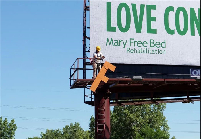 但位于美国密歇根州的玛丽免费床位康复医院(Mary Free Bed Rehabilitation Hospital)偏不这么做。玛丽医院的这块广告牌上,写着大大的“love conquer all”(真爱战胜一切)。令人感到意外的是,广告语中的“ALL”(全部)原本应该为“FALL”(坠落),玛丽医院别出心裁地将字母“F”真正地坠落了在广告牌的底座上,让原意“真爱战胜坠落”巧妙变成了“真爱战胜一切”,表达了他们想要传递希望与爱的讯息。